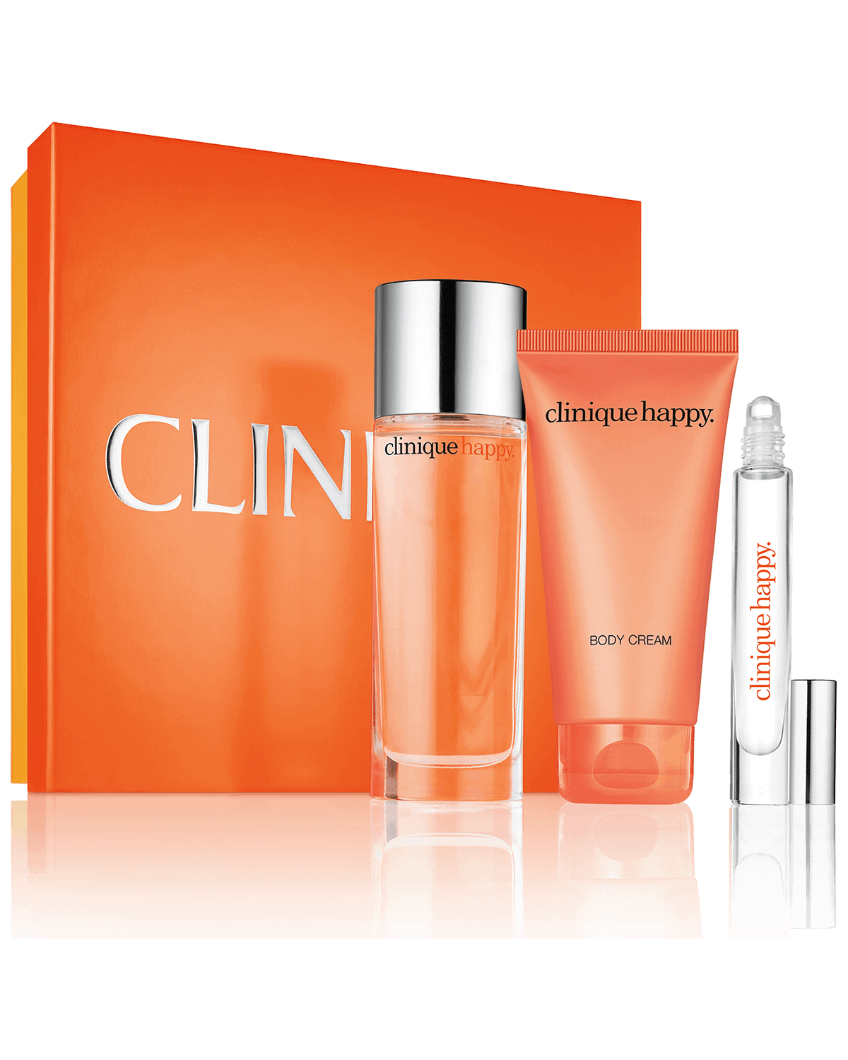 Un trío de nuestra fragancia consentida, para una felicidad de pies a cabeza. Clinique Happy Perfume Spray deleita con un toque cítrico, una abundancia de flores, una mezcla de emociones. Continúa la feliz experiencia con una Crema Corporal de hidratación intensa y un perfume en presentación Rollerball, ideal para llevar. Listo para obsequiar en una alegre caja anaranjada.