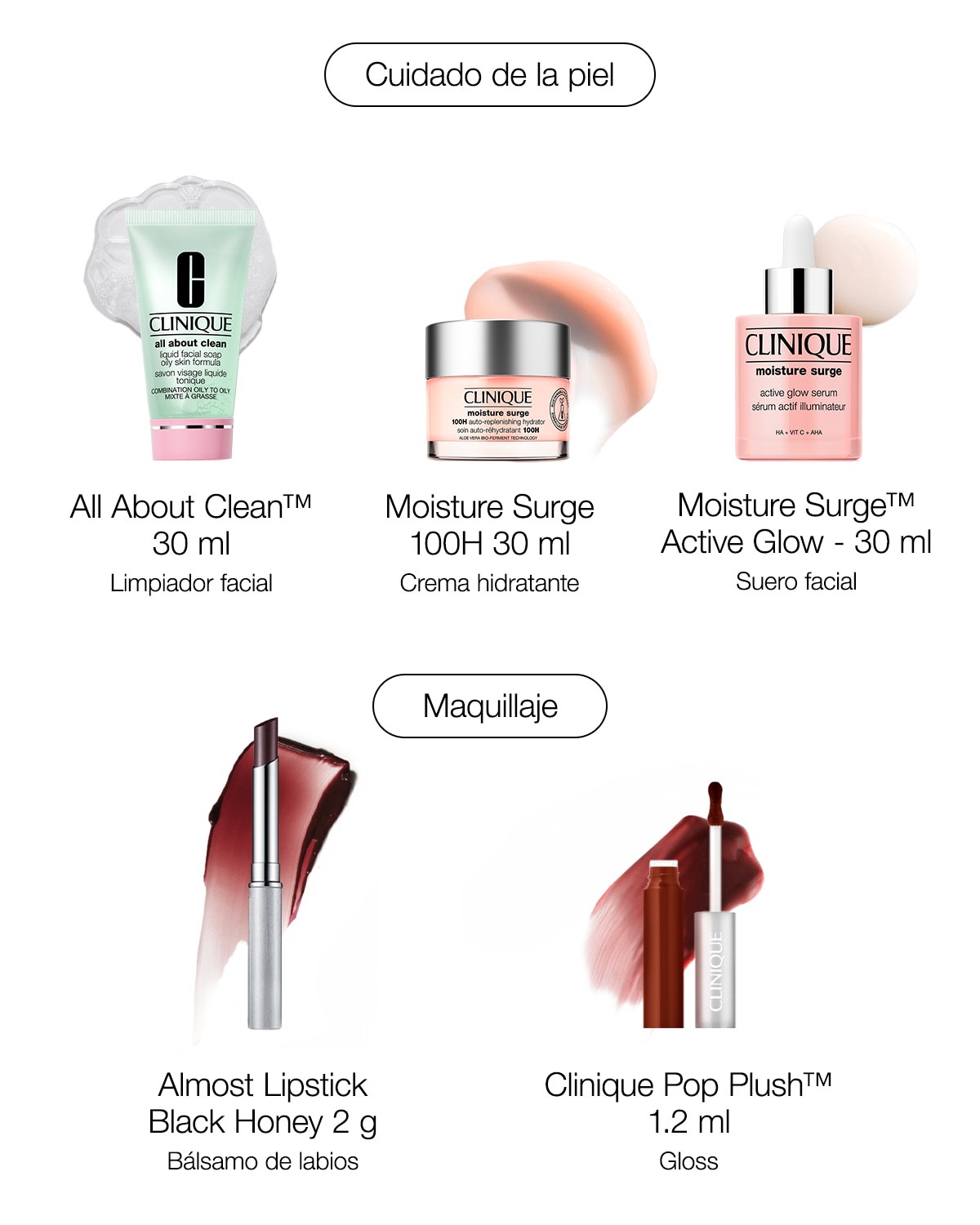 Un ritual completo para piel luminosa y labios irresistibles. Comienza con limpieza suave, hidrata y potencia tu glow con Moisture Surge 100 HRS y Glow Serum, y termina con el look Black Honey en bálsamo y gloss. Todo en una cosmetiquera lista para llevar tu rutina a donde vayas.