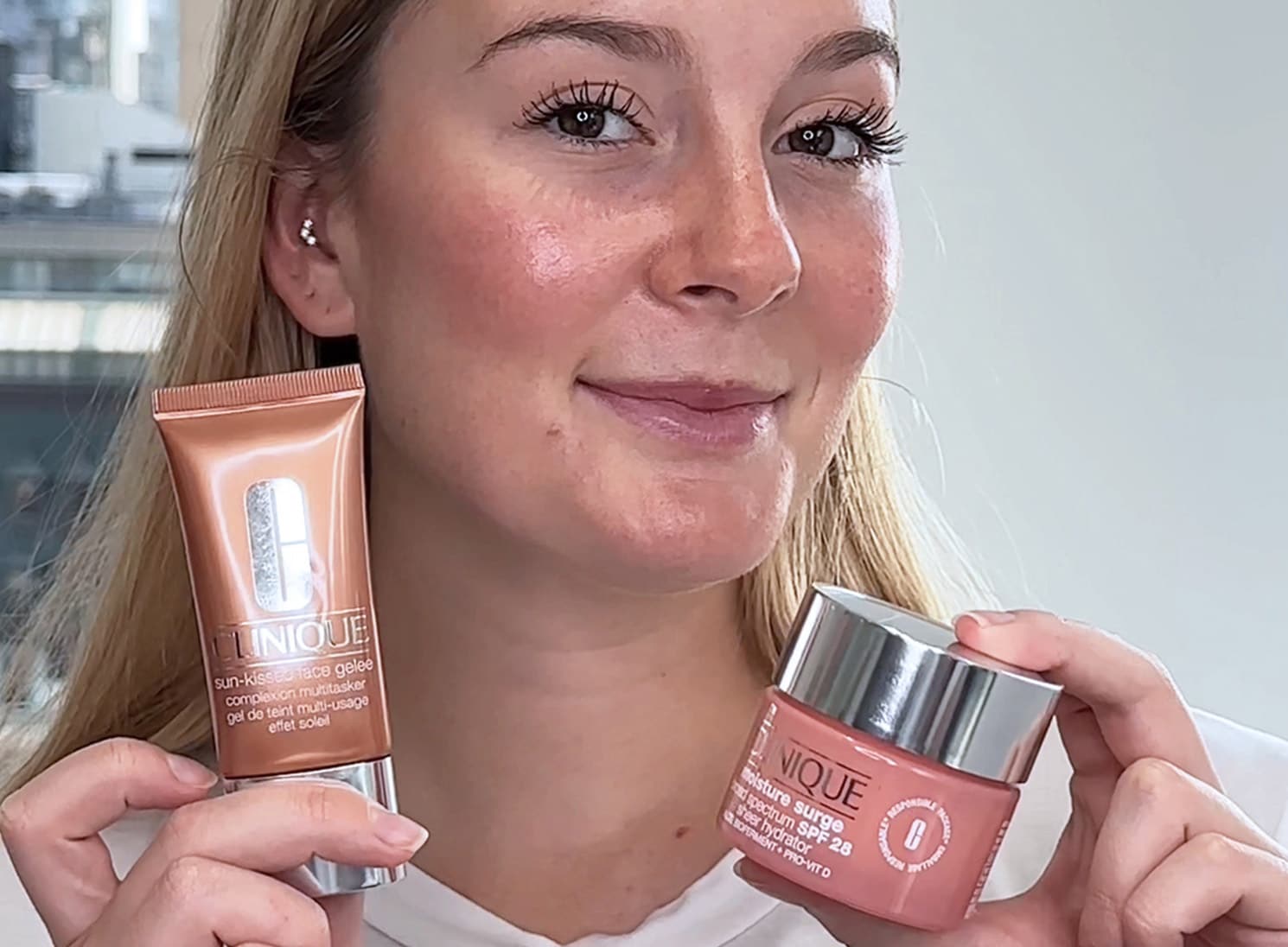 Recomendamos aplicar Moisture Surge 100H Auto-Replenishing Hydrator, nuestra refrescante crema hidratante libre de aceite, a base de gel que penetra profundamente y dura 100 horas. Hidrata con un complejo de biofermento de aloe y ácido hialurónico para un brillo hidratado y radiante. Simplemente mezcla tu hidratante con unas gotas de bronceador en el dorso de tu mano, aplícalo en tu rostro y difumina bien.