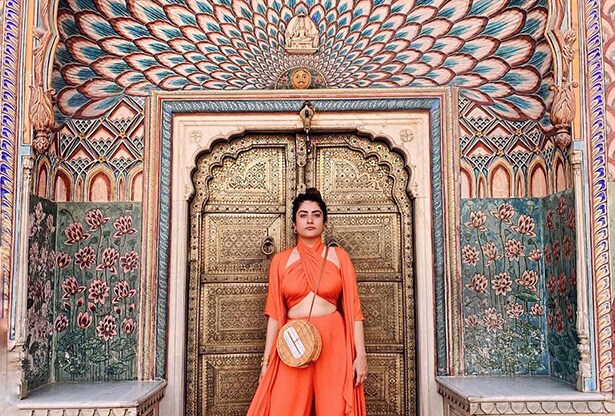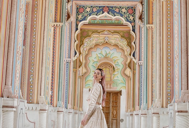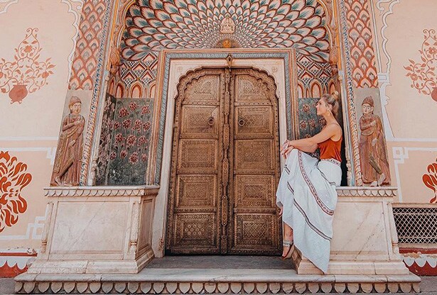 Existen cuatro hermosos portones en el Palacio de la Ciudad, cada uno representa una estación. Aquí, Trishala Sikka y Katie Manwaring están en frente de la Puerta del Loto, que representa el verano.